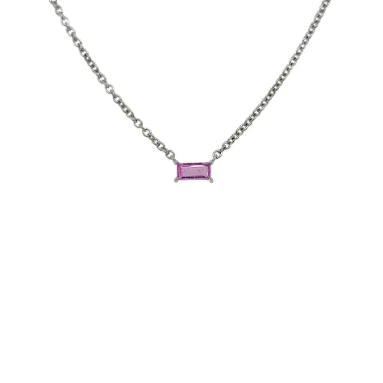 9k White Gold Necklace Featuring 6×3 Baguette Pink Sapphire