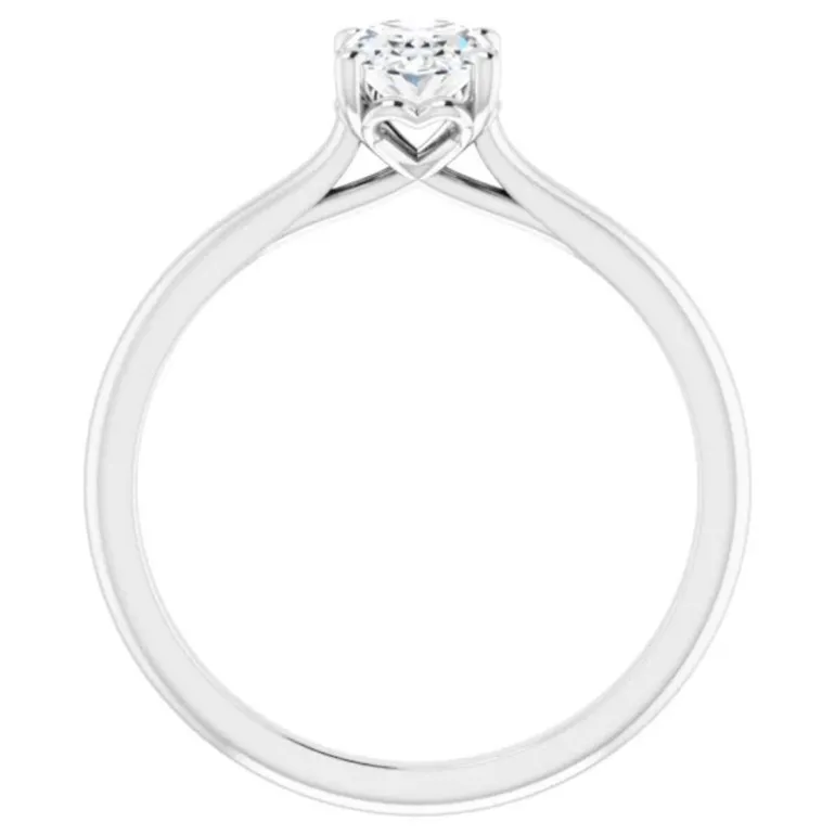 This Amavi solitaire ring is set in 14k gold and features a sweet heart motif on the sides of the ring encasing a 7x5mm (approx 0.75ct) oval cut moissanite.
