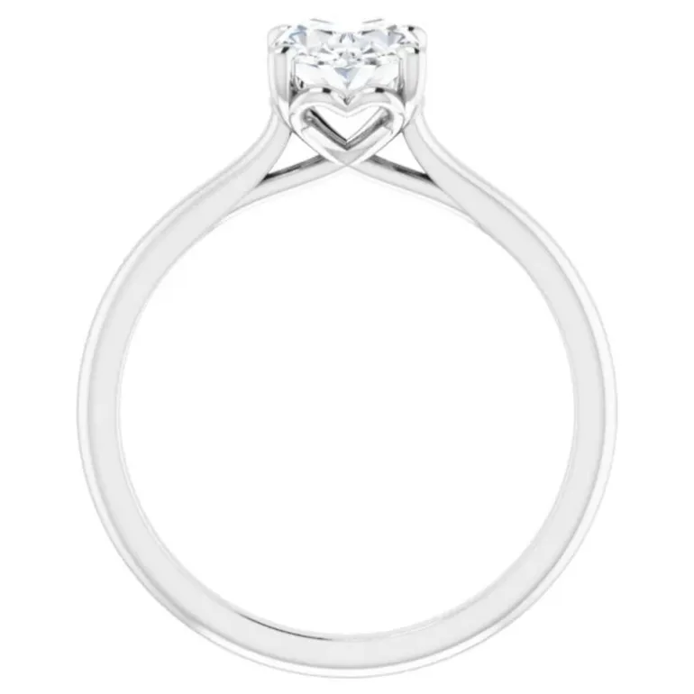 This Amavi solitaire ring is set in 14k gold and features a sweet heart motif on the sides of the ring encasing a 8x6mm (approx 1.25ct) oval cut moissanite.