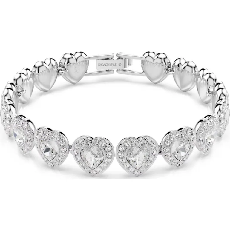 Love shines brightly in this Swarovski bracelet, which takes romantic extravagance to the next level. The rhodium plated design features a full circle of heart-shaped crystals, each surrounded by a glittering halo of clear pavé. Pair this bracelet with other matching jewellery to create your own expressive combinations.