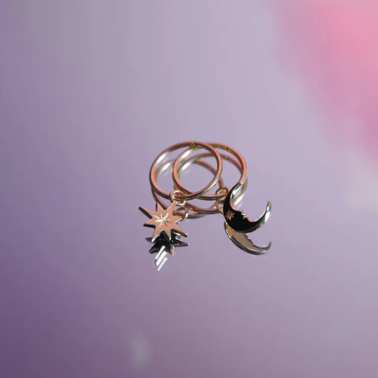 On opposite sleeper hoops, a crescent moon and a shining star twinkle as though in orbit through the night sky to create the Crescent Moon & Star Sleepers in sterling silver.