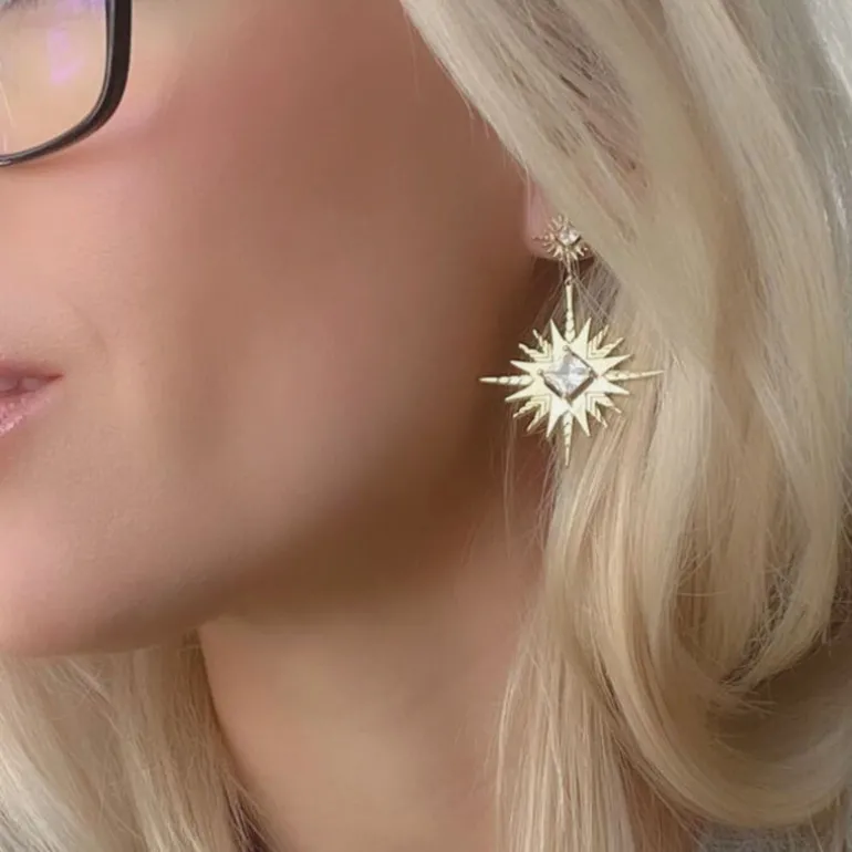 Unleash the celestial beauty within you with the Solar Earrings from Lindi Kingi, designed to turn heads at every sun-kissed soiree. These stunning adornments capture the fiery essence of the sun with their white zirconia centre and explosive solar charm. Each earring dangles with the promise of turning ordinary moments into milestones, measuring 3.5 cm in both length and width for a statement that is bold yet elegant. Crafted with precision, the post charm adds an additional touch of sparkle at 1.5 cm long and 1.2 cm wide. Embrace your inner solar goddess with these golden treasures, perfect for illuminating your summer events.