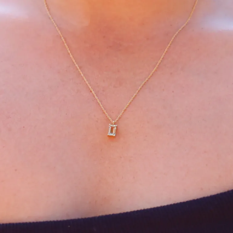 In a beautiful short style necklace, yellow gold has been perfectly paired with the green amethyst. The gorgeous, bright tones from the rectangle cut of the green amethyst shine as the stone hangs from the yellow gold chain. We love how simple yet stunning this necklace is, perfect for yourself or someone special.