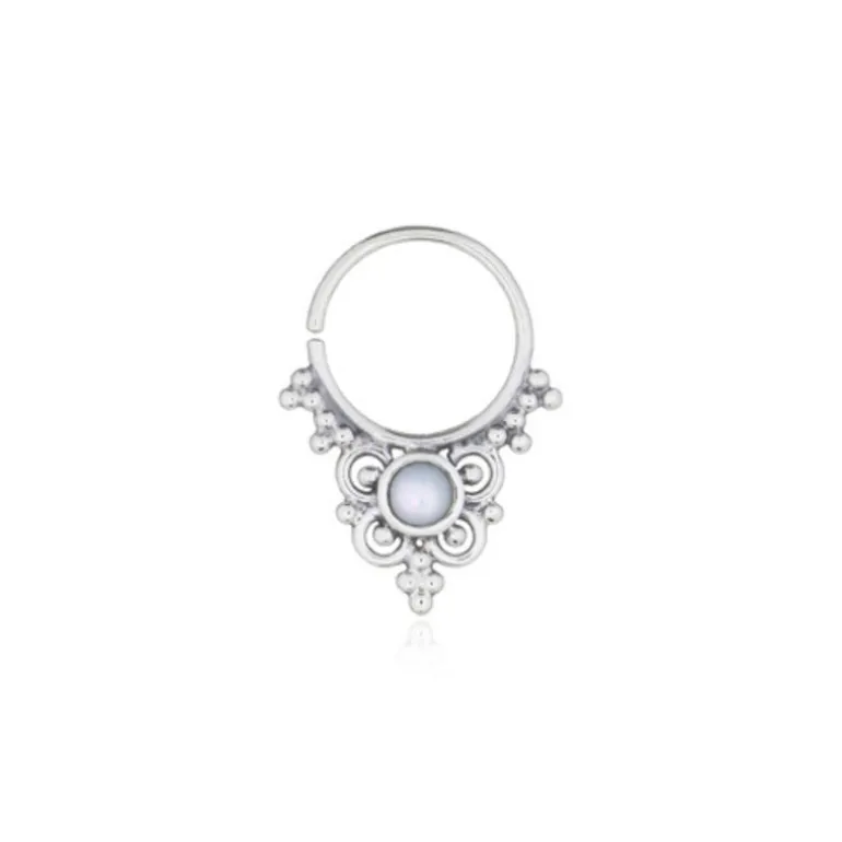 The ‘Pasiphae’ Mother of Pearl Piercing from our Luna collection blends elegance with a touch of bohemian charm. Crafted from sterling silver, this single piercing features a beautifully intricate design centred around a lustrous mother of pearl. The delicate silver detailing surrounding the pearl adds a vintage feel, making it a standout piece whether worn alone or as part of an ear stack. Ideal for those who love to mix classic elements with a modern twist.