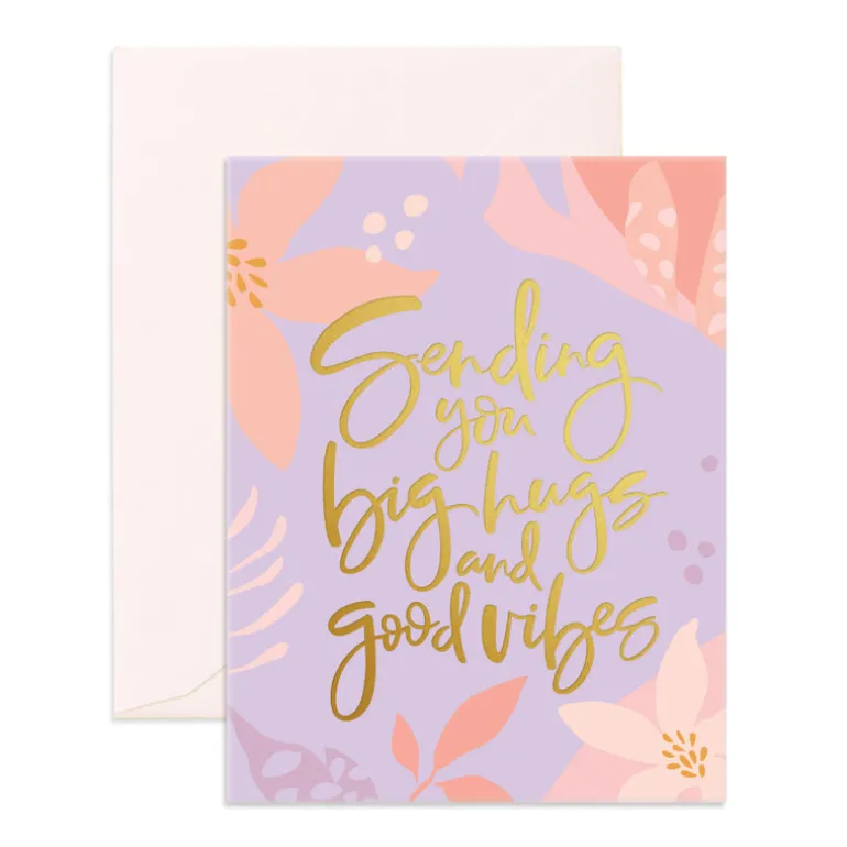 A beautiful full colour card printed with ‘Sending Big Hugs and Good Vibes’ in metallic gold foil.