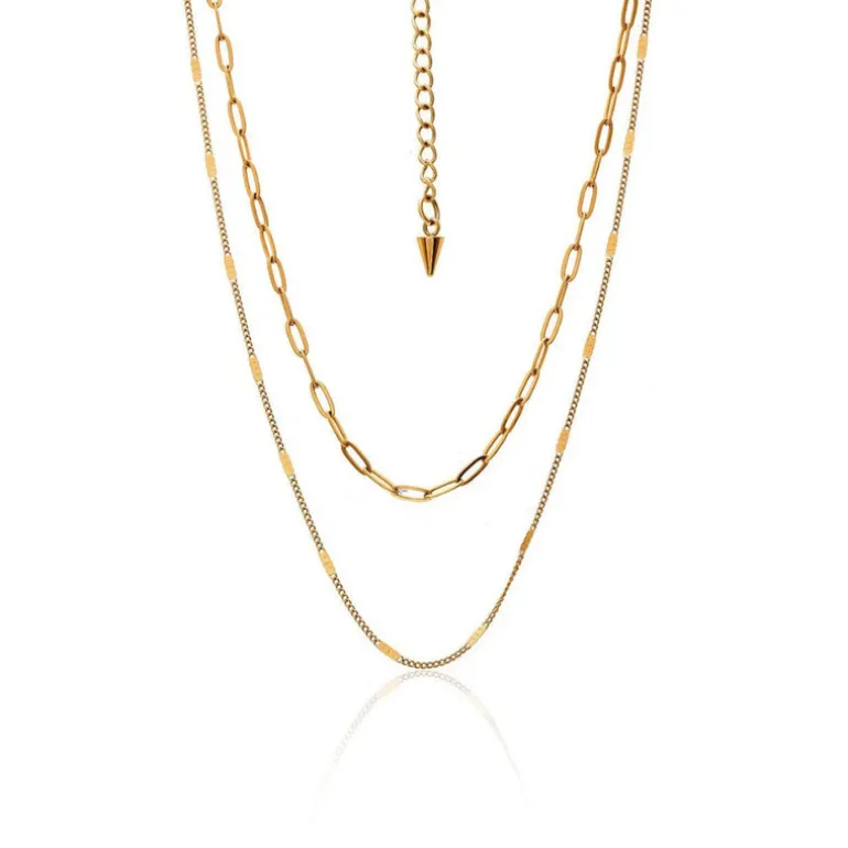 Elevate your jewellery collection with the Horizon Necklace, featuring a pre-styled double-layered design, with a fine paper clip chain and a delicate curb chain. Crafted with durable 14k gold vacuum-plating over stainless steel, it combines luxury with lasting quality. The adjustable extension chain, highlighted by our signature Silk & Steel spike, allows for customisable length to suit various necklines.