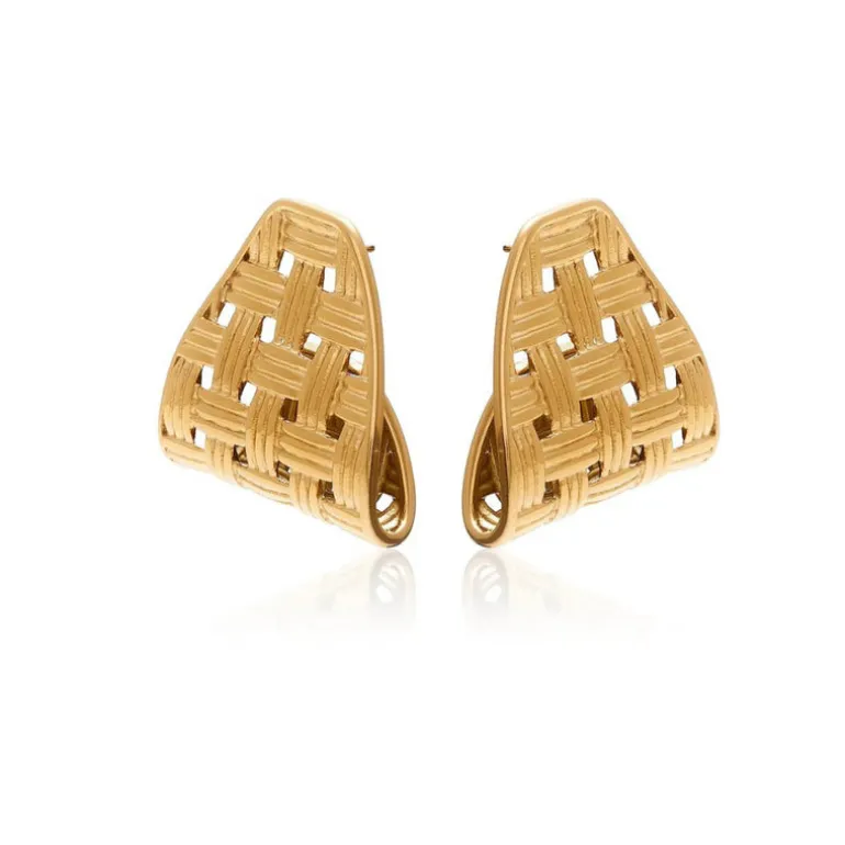 Unveil your bold style with the Lattice Statement Earrings from our Golden Hour collection. These statement-yet-lightweight earrings feature an open woven design that gracefully tapers into a wide earring, curling up elegantly at the back. Crafted from 14 karat gold-plated stainless steel, these vintage-inspired pieces pay homage our early days of vintage couture, blending the iconic styles of the 80s and 90s with a contemporary twist.