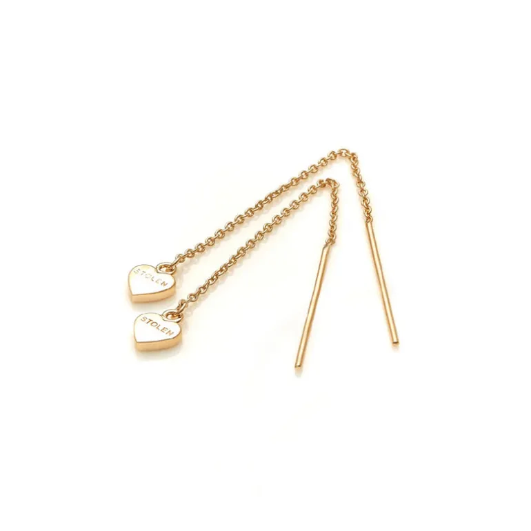Our Falling Stolen Heart Earrings are made from a sterling silver base and coated in 1.5microns of 18k yellow gold. This pair of thread-style earrings feature our iconic baby Stolen Heart charms set on an ultra-fine chain.