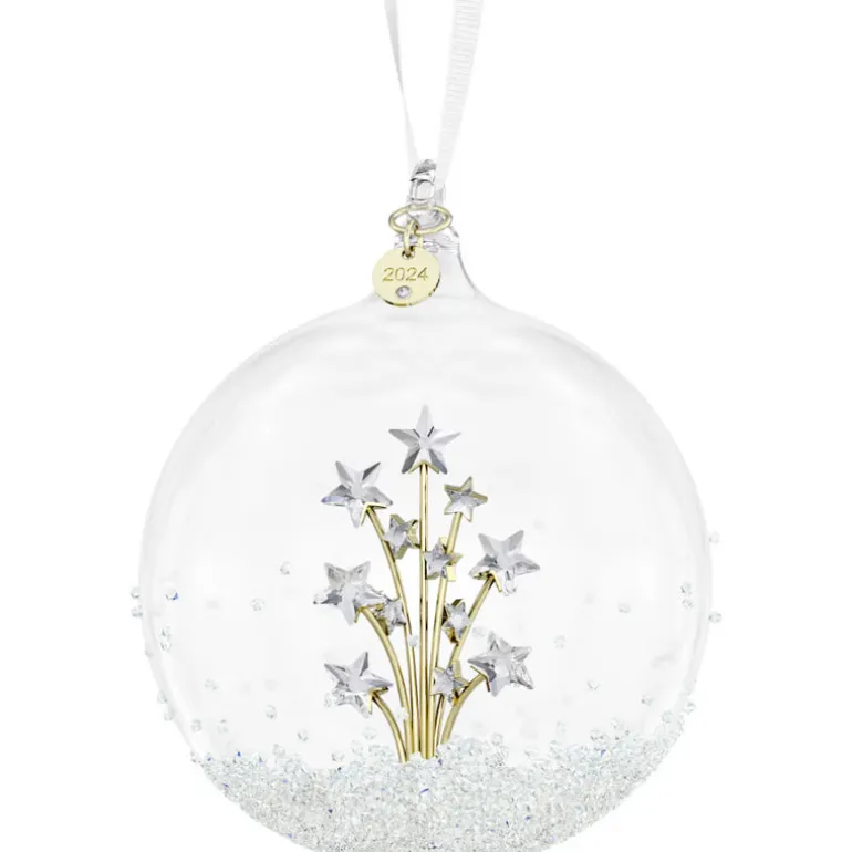 This year’s Annual Edition Ball Ornament celebrates the festive season with a joyous fireworks display. This wondrous creation showcases Swarovski’s innovation and mastery of crystal, featuring 396 radiant facets. The ball itself is also encrusted with crystals to resemble freshly fallen snow, while inside, the fireworks are crafted from clear crystal stars and champagne gold-tone touches. The ornament is suspended from a white grosgrain ribbon and features a champagne gold-tone tag engraved with “2024.” Hang it from a window or on your tree to revel in the magic of the holidays throughout the season. Decoration object. Not a toy. Not suitable for children under 15.