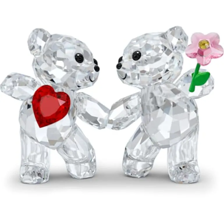 With a total of 867 facets, this charming pair of Kris Bears sparkles beautifully in clear crystal. One holds a red crystal heart, while the other holds a pink crystal flower with a green lacquered metal stem and leaf. A wonderful gift idea for a wedding, anniversary or any other special occasion. Decoration object. Not a toy. Not suitable for children under 15.