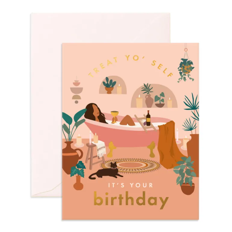 A beautiful full colour card printed with ‘Treat Yo’ Self It’s Your Birthday’ in metallic gold foil.