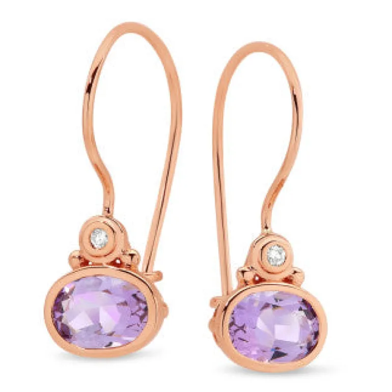 Measurements – Pink Amethyst Size: Approximately 6mm; Diamonds: Round Brilliant Cut; Total Diamond Weight: 0.02ct; Earring Length: 18mm (Shepherd Hook Style).