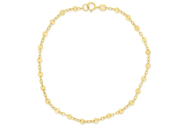 Introducing the “Golden Disc Cascade Bracelet” — a delicate, yet striking accessory that exudes sophistication and charm. This exquisite piece is finely crafted from 9ct yellow gold and features a series of 3mm flat discs, each elegantly linked by triple cable jump rings, creating a fluid cascade effect that catches the light with every movement. Measuring 19cm in length, this bracelet secures comfortably with a bolt ring closure, ensuring a secure and adjustable fit. Ideal for both everyday elegance and special occasions, this bracelet is a versatile addition to any jewellery collection.