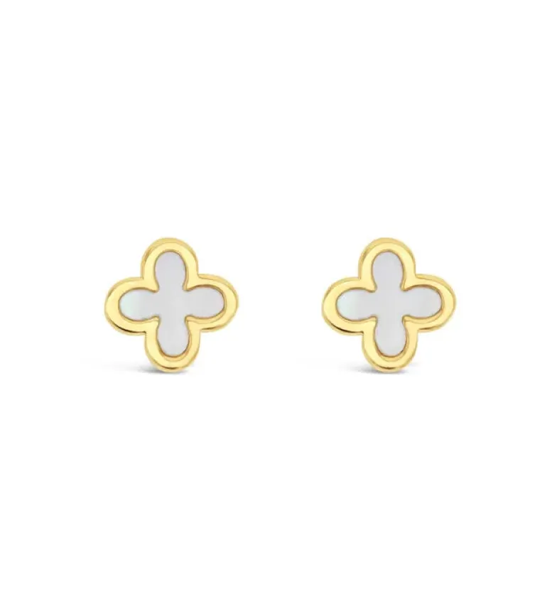 Add a touch of luck and elegance to your jewellery collection with these charming 9k Yellow Gold Mother of Pearl Four Leaf Clover Stud Earrings. Each earring features a delicate four-leaf clover design crafted from lustrous mother of pearl, set in a 9k yellow gold frame. Perfect for any occasion, these earrings are an exquisite blend of sophistication and whimsy.