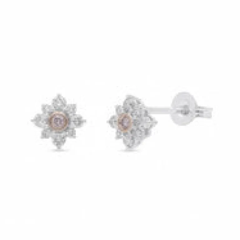 Adorn your ears with these stunning 9k white gold diamond earrings, featuring a beautiful rose gold setting that highlights the captivating centre pink diamond. The intricate design is enhanced by sparkling white diamonds, creating a harmonious blend of elegance and sophistication. Perfect for adding a touch of glamour to any outfit, these earrings are a timeless addition to your jewellery collection.