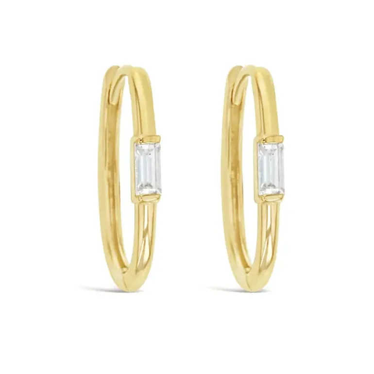 Introducing our Rectangular Sparkle Gold Paperclip Huggie Earrings, elegantly crafted in 9ct yellow gold. These chic earrings boast a distinctive oval paperclip shape, enhanced with gleaming rectangular cubic zirconia stones, each measuring 4mm by 2.5mm. The design is completed with a 14.5mm x 8mm inner diameter and a fine 1.5mm round tube, ensuring a light and comfortable fit. These earrings are perfect for those who appreciate a blend of contemporary style and classic elegance, making them a versatile addition to any jewellery collection. Ideal for both daily wear and special occasions, they offer a subtle yet striking sparkle that is sure to turn heads.