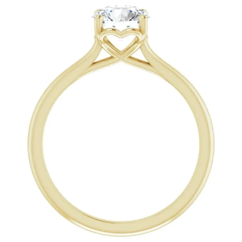This Amavi solitaire ring is set in 14k gold and features a sweet heart motif on the sides of the ring encasing a 6.5mm (approx 1.00ct) round brilliant moissanite.