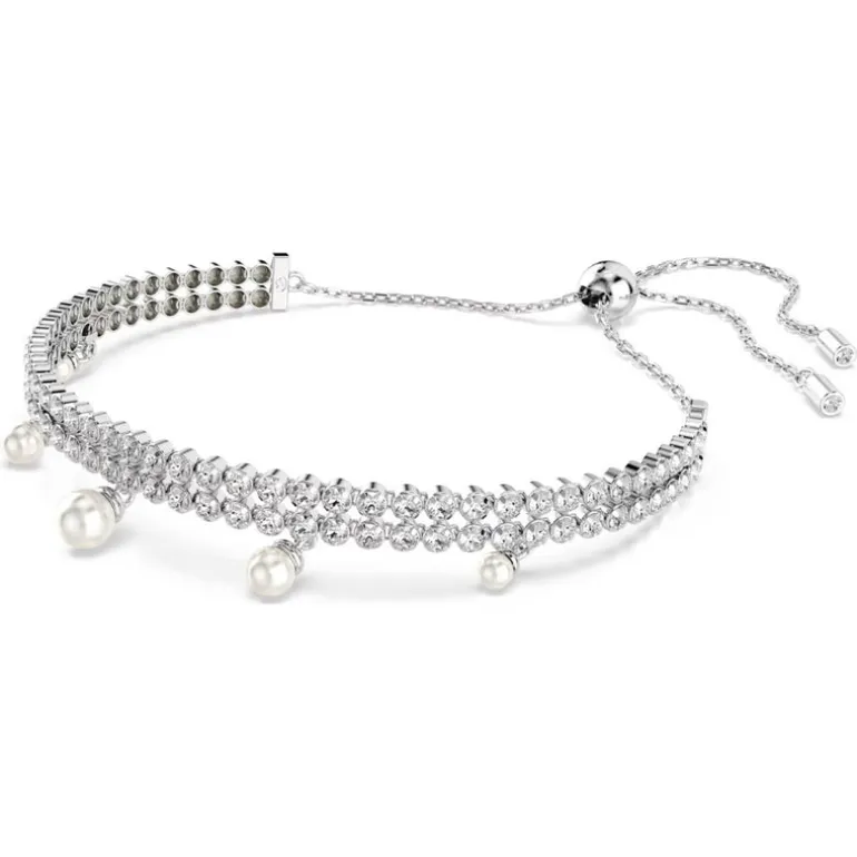 Discover a pure expression of elegance in this refined bracelet. Easily adjustable with a sliding ball closure, the rhodium plated design features two rows of cupchain, set with clear Geometric Swarovski Zirconia in round cuts. An adornment of Swarovski Crystal Pearls is then added below for a sensational look of luxury. Pair this bracelet with the matching choker to create your own expressive combination.