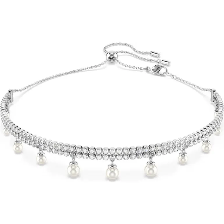 Make a lasting impression with this bright and extravagant choker. Easily adjustable with a sliding ball closure, the rhodium plated design features two rows of cupchain, set with clear Swarovski Zirconia in round cuts. An adornment of Swarovski Crystal Pearls is then added below for a sensational look of pure star power. Pair this choker with the matching bracelet to create your own expressive combination.