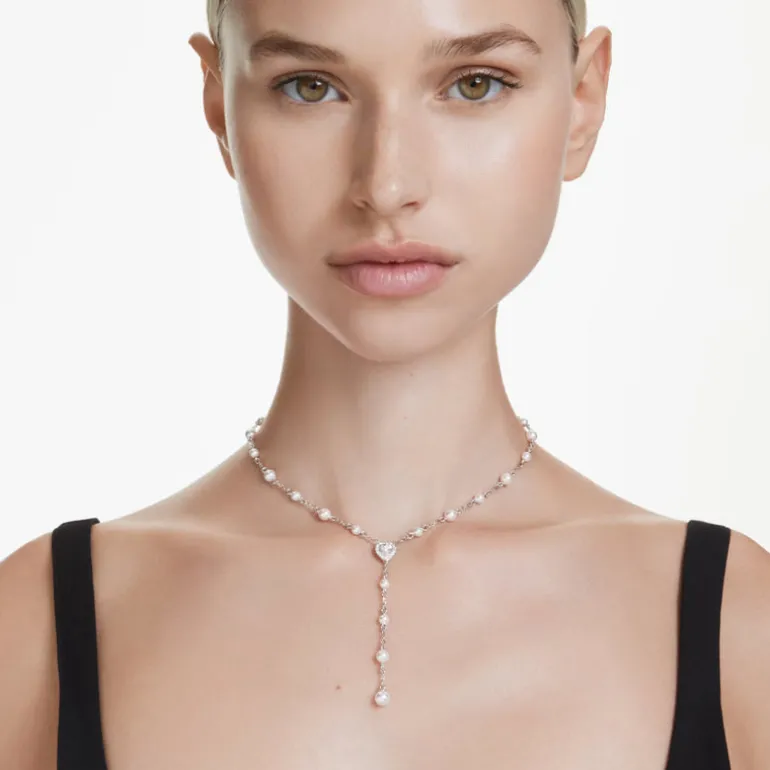 Crafted with finesse and timeless beauty, this T-shaped necklace is emblematic of Swarovski’s joyful extravagance. The rhodium plated design features a delicate chain accented with Swarovski Crystal Pearls. A heart-shaped motif is placed at the centre and is surrounded by glittering pavé, while the hanging strand provides a final flourish of sophistication. Pair this necklace with other matching jewellery to create your own radiant combinations.