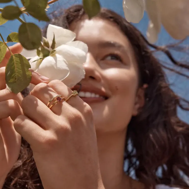 By Charlotte’s Gold Kindred February Birthstone Ring features a kaleidoscopic cluster of ethically and sustainably sourced natural gemstones, including amethyst and iolite.
