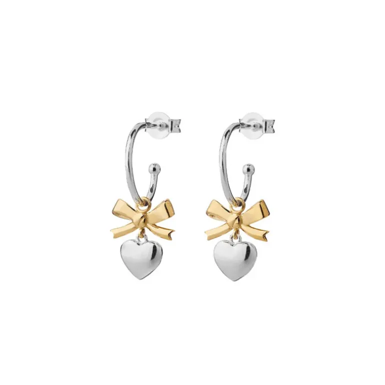 The whimsical and romantic Superlove earrings have been miniaturised, presenting the plump and inflated Victorian heart in a new delicate manner. Swinging from hoops, the mini Superlove charms create the perfect earrings in sterling silver accented with a 9ct yellow gold bow.