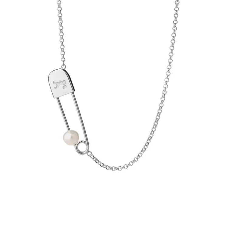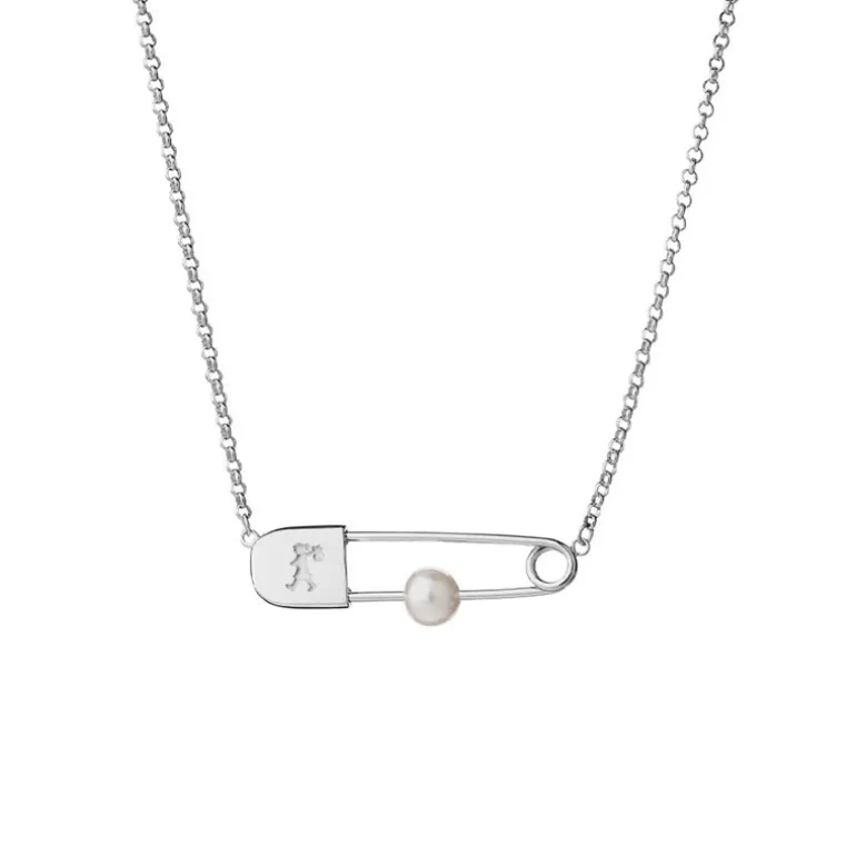 The safety pin, a do-it-yourself fashion icon and symbol of resilience, has been revamped into a modern take on the classic charm bracelet. This necklace features the Runaway Girl safety pin and a single freshwater pearl, suspended between a fine belcher chain. The full-size, fully functioning safety pin, once a defiant punk staple, allows you to get creative and personalise by adding your favourite charms.