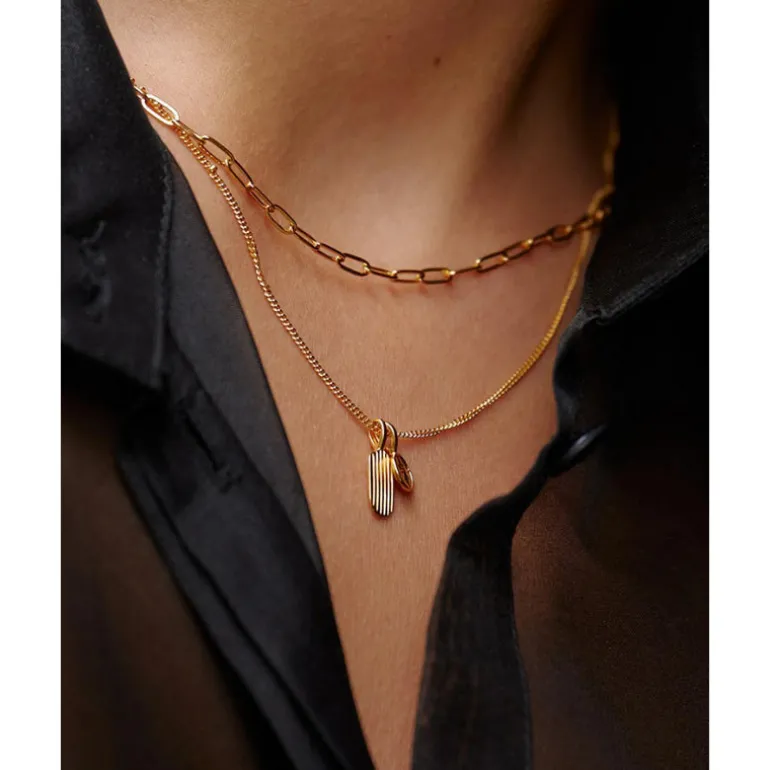 A classic traveller chain, embellished with a duo of symbolic charms; a simple tag and a coin featuring a compass motif. Refined, wearable, sillhouettes for those who love to wander.