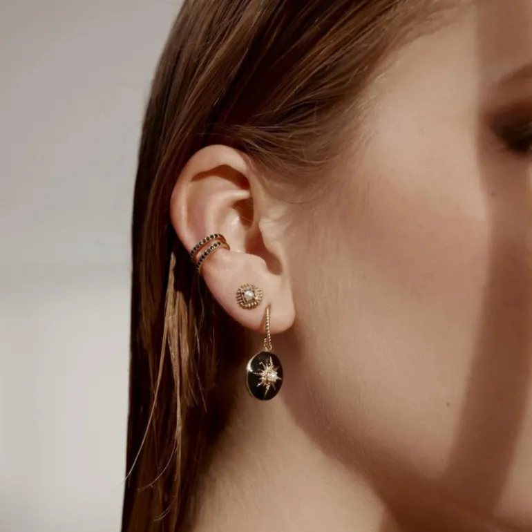 Introducing our Petite Perle studs, a stunning complement to our Petite Perle necklace design. These earrings make a delicate statement, allowing you to wear them solo for a touch of simple sophistication or stack them on your earlobes for a super luxurious detail. Crafted with attention to detail, they feature delicate radiating spikes with a lustrous freshwater pearl centre. For the ultimate finishing touch, pair them with our Noire hoop earrings for an elevated designer look. Made from 14k gold-plated sterling silver, these studs are both versatile and chic, adding a touch of luxury to any ensemble.