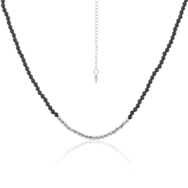 Simplicity is central to Silk & Steel’s jewellery and this natural black necklace, made with tiny onyx beads and accented with a row of silver faceted hematite, captures the minimalist mood.