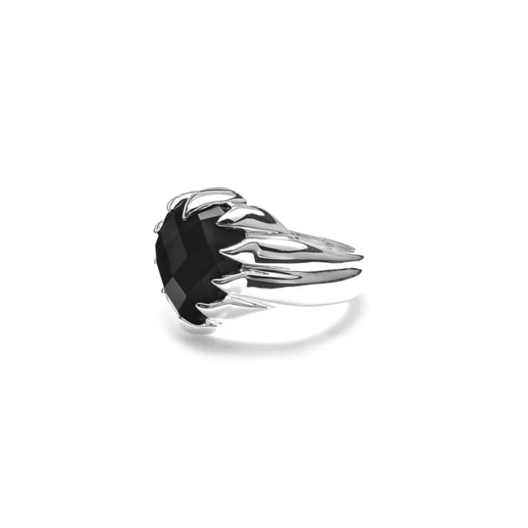 The Love Claw Drop Ring is designed to be your special statement piece. This tough-yet-beautiful ring is adorned with a large natural Onyx stone, set in a wide solid sterling silver band.