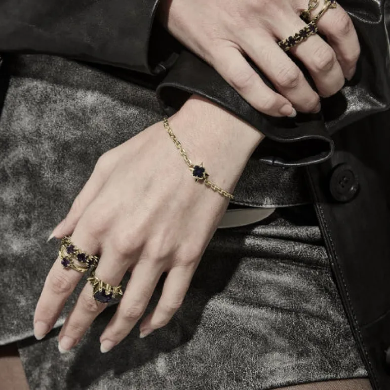 Stars, spikes, and Dark Amethyst stones come together in striking harmony, forming a futuristic flower with sharp geometric angles. The deep purple stones captivate with their profound sparkle, secured by fierce spikes and claws. The rich gold beautifully complements the stone’s hues, adding sophistication and depth to every piece. This capsule is a bold, heavy-metal twist on the iconic ‘Love Claw’ collection—modern luxury with a pulse.