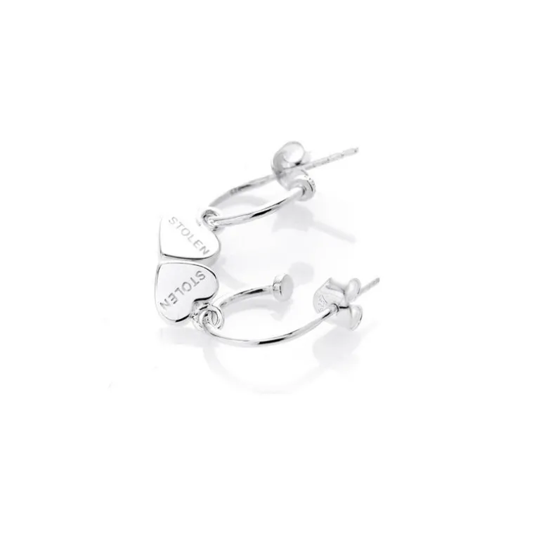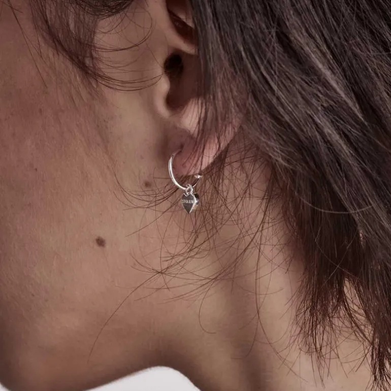 Our Stolen Heart Anchor Sleepers are crafted from solid sterling silver with a high polish finish. This pair of beautiful drop earrings feature delicate mini heart charms with hallmark logos, suspended on our classic anchor hoops.