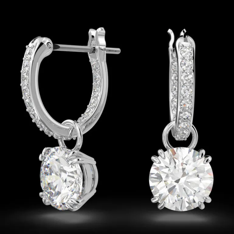 These mesmerizing drop earrings from the Constella family have wear-forever power. Striking the balance between dramatic and refined, dazzling centre stones are enhanced with pavé on the gallery and hoops, which are set with rhodium plating. Wear them with your hair tucked to really let them shine.