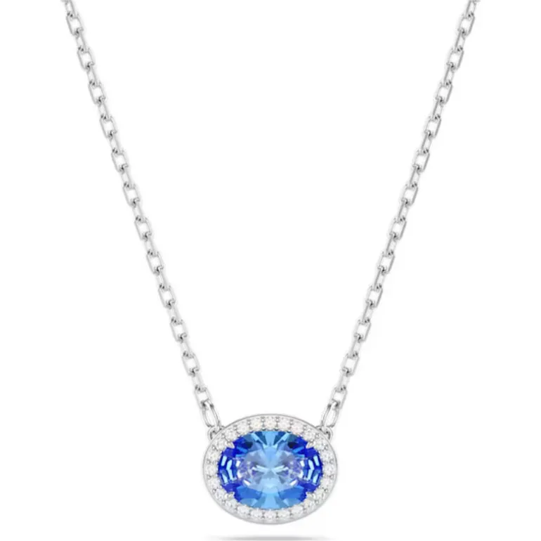 Inspired by a galaxy of shimmering stars, this striking Constella pendant glows with wonder. The rhodium plated chain features an oval-shaped central Swarovski Zirconia, which is presented in dazzling blue and framed by a pavé of clear round crystals. An additional stone is also placed at the end of the elongation for an extra touch of luxury. Pair this necklace with matching Constella earrings to colour your look with joy.