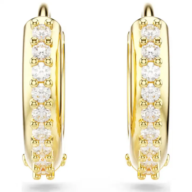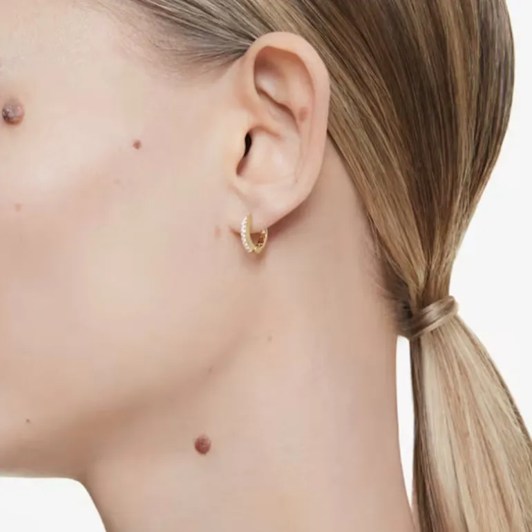 Ignite your style with these shimmering mini hoops. The pierced earrings are gold-tone plated and adorned with clear prong-set Swarovski Zirconia on the outer section. An effortless way to infuse your look with instant radiance.