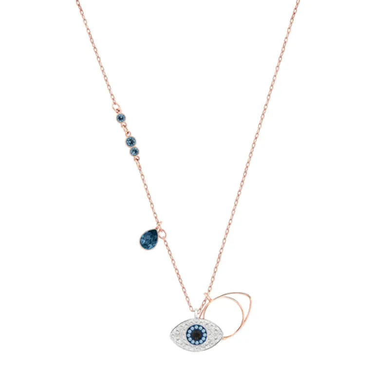 The mixed-plated Duo Pendant Evil Eye adds a mystic touch to any look. It features one eye motif in blue, black, and clear crystal pavé and one in rose gold-plated metal. The pendant comes on a rose gold-plated chain embellished with dark blue crystals.