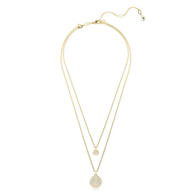 This shimmering layered pendant is the ideal way to fill your style with light. The gold-tone plated design features two chains, each with a domed meteor motif that is beautifully adorned with a snow pavé of clear round crystals in different sizes. For extra versatility, the pendant can be reversed, revealing a halo of crystals around the larger motif and a single crystal at the centre of the smaller motif. A wondrous gift for yourself or a loved one.