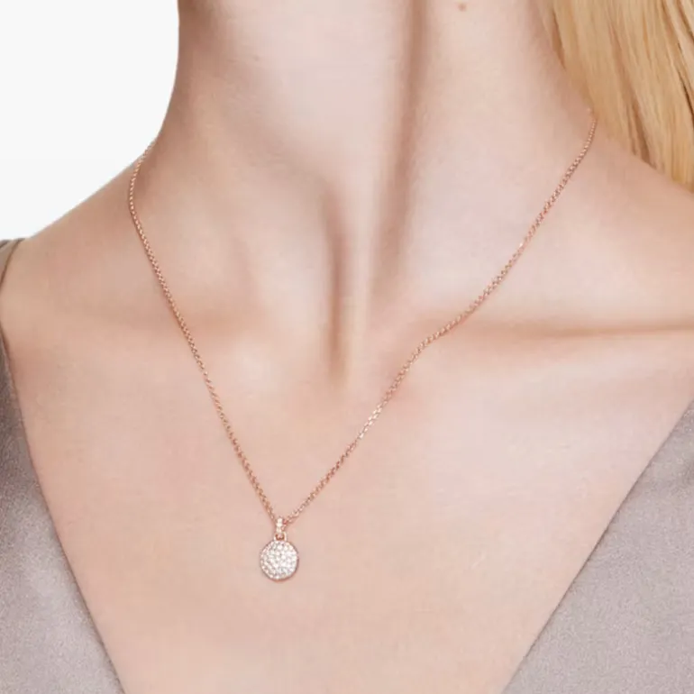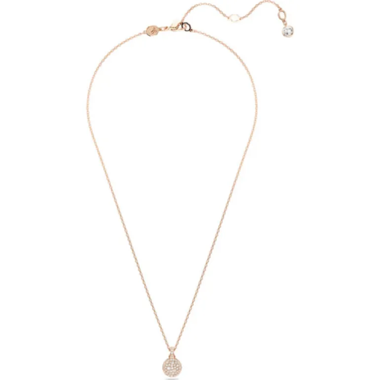 This galaxy-inspired pendant will bring dazzling impact to any style. The rose gold-tone plated design is worn on a delicate chain with a lobster closure and features a domed meteor motif that is beautifully adorned with a snow pavé of clear round crystals in different sizes. Wear it as a wondrous piece of light-catching joy.